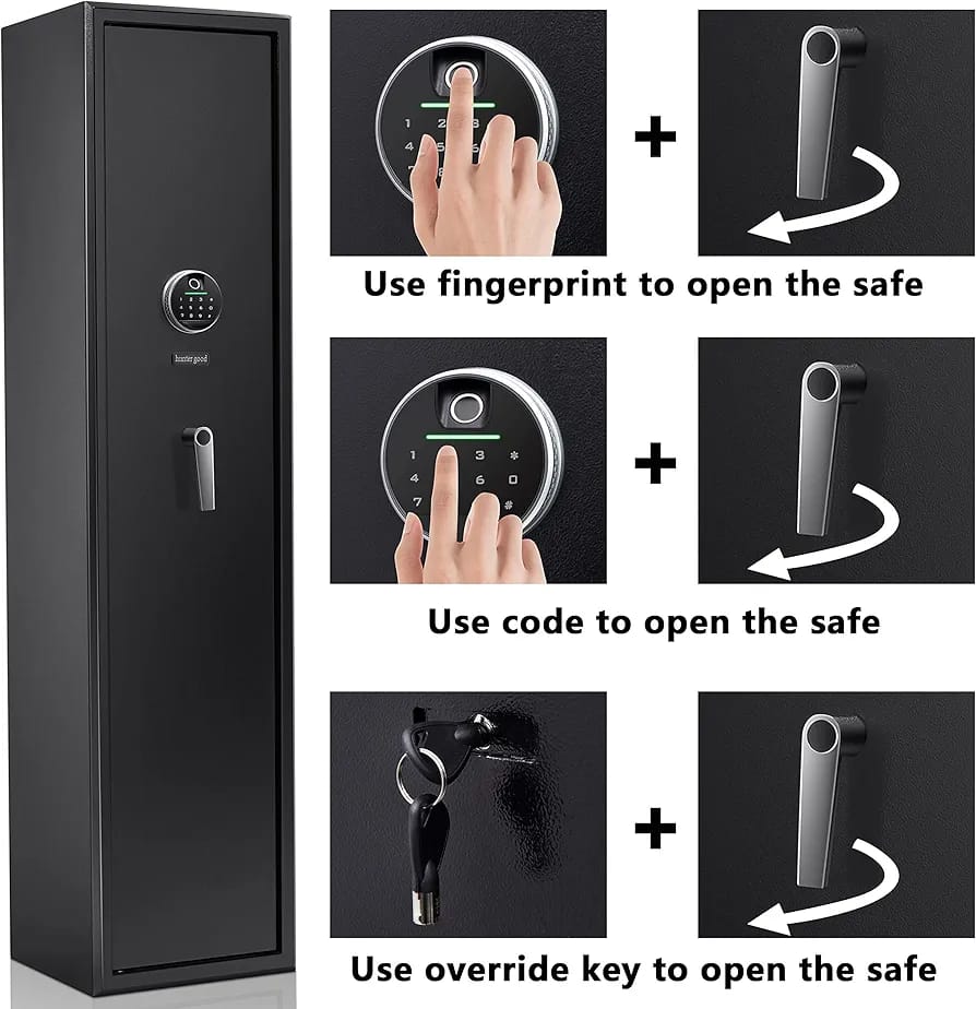 -  Cajas fuertes biométricas para rifles y escopetas; Tipo de cierreBiométrico, Cerradura de combinación electrónicaSistema de acceso seguro: el uso de un panel biométrico de alta tecnología garantiza que la caja fuerte de tu pistola sea altamente resistente a los robos. La apertura de huellas dactilares de acceso rápido y el modo de apertura de código de combinación te garantizan abrir de forma segura La fuente de alimentación externa de 9 voltios garantiza que aún puedes abrir de forma segura en modo de salida interior. La llave de anulación es útil cuando la alimentación está apagada y el sistema electrónico está bloqueado.