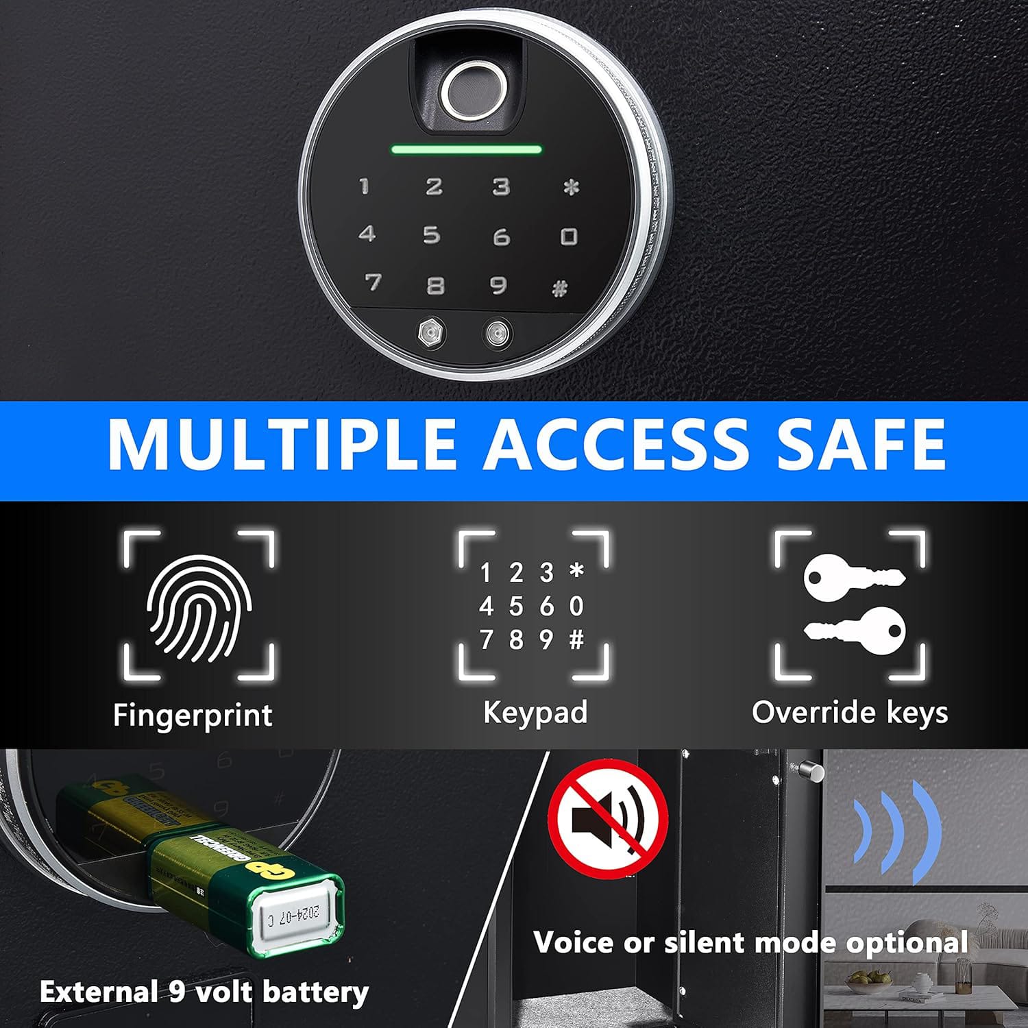 - Construcción de cuerpo de alta seguridad y función de uso conveniente: diseño de aspecto único. Estructura segura reforzada y biselada que evita que el cuerpo sea invadido violentamente. El cuerpo está hecho de acero de aleación de carbono bajo. El modo silencioso mejora la privacidad. La luz LED interior proporciona la máxima comodidad en entornos oscuros.Fácil instalación: 4 agujeros de anclaje preperforados en la parte posterior y 4 agujeros de anclaje en la parte inferior fáciles de fijar en la pared o el suelo. Ofrece 4 pernos de anclaje.