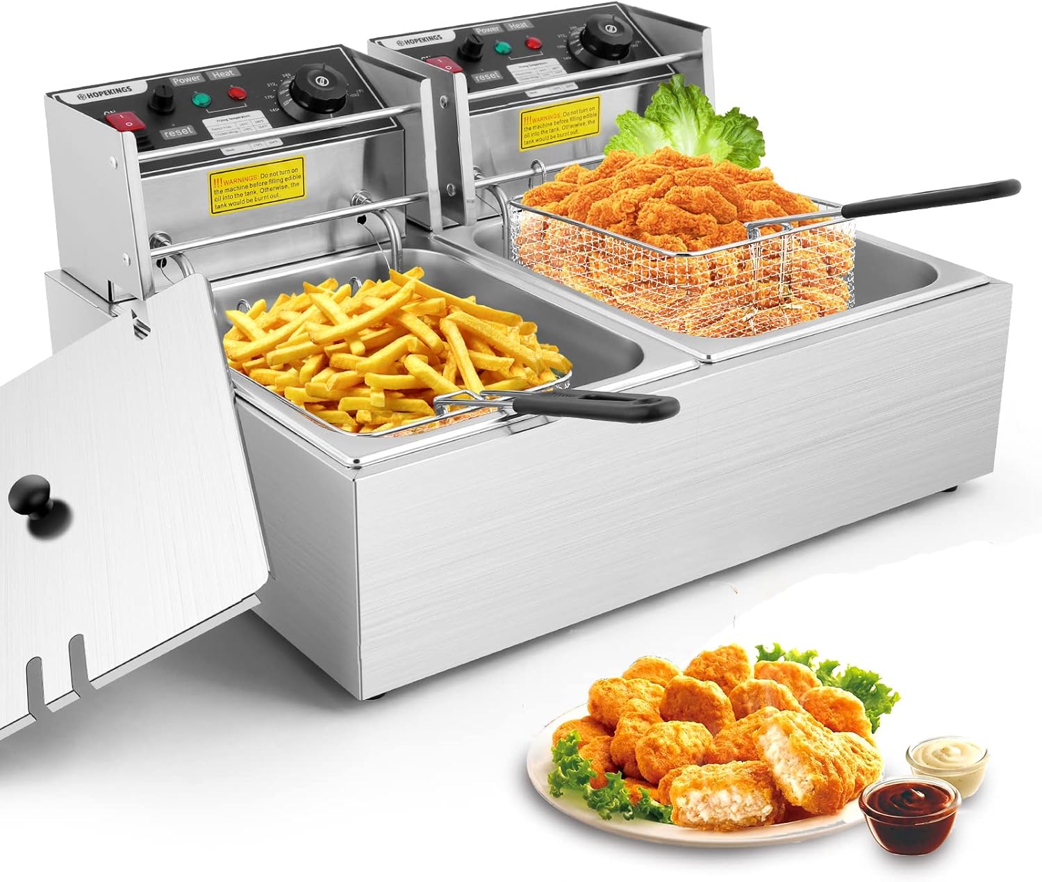 La máquina adopta un diseño desmontable. La tapa, la cesta, el mango, el tanque, el calentador y la partición de residuos de aceite se pueden desmontar para facilitar la limpieza; instalación simple, adecuada para adultos. Rango de temperatura ajustable: 60 a 200 ° C (140 a 392 ° F), adecuado para 110v, 60Hz, potencia: 2500 W cada freidora, total: 5000 W; el aceite se puede calentar rápidamente;